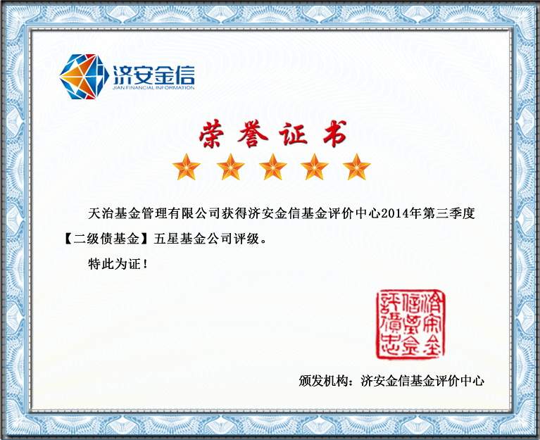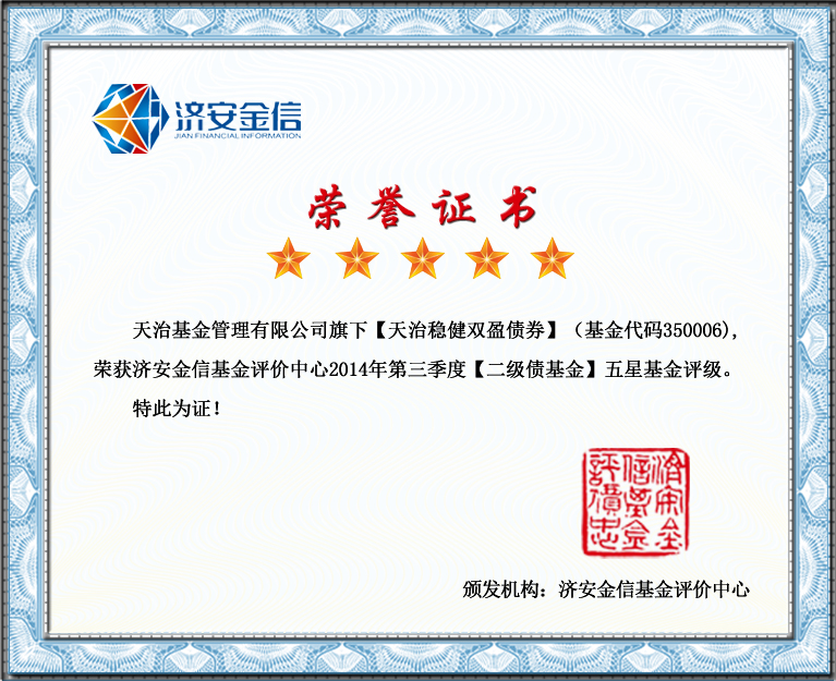天治基金管理有限公司2014年11月7日荣膺济安金信基金评价中心2014年第三季度【二级债基金】五星基金公司评级。同时旗下【天治稳健双盈债券】(基金代码350006),荣获济安金信基金评价中心2014年第三季度【二级债基金】五星基金评级。特此祝贺!